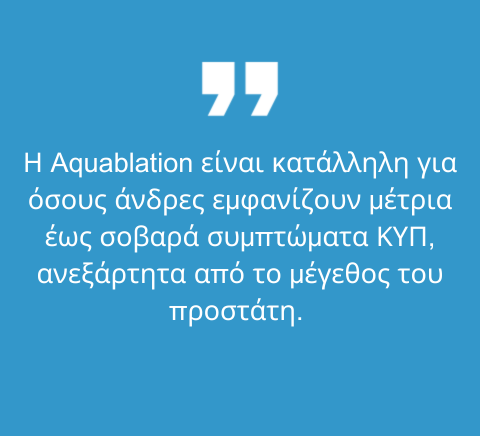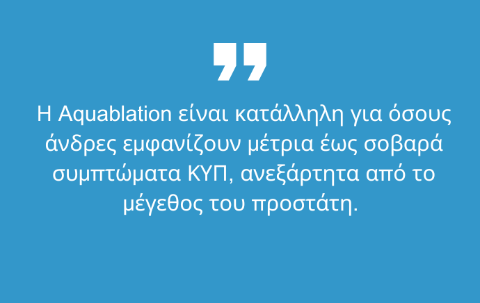Η Aquablation είναι κατάλληλη για όσους άνδρες εμφανίζουν μέτρια έως σοβαρά συμπτώματα ΚΥΠ, ανεξάρτητα από το μέγεθος του προστάτη. Επίσης, μπορεί να εφαρμοστεί σε περιπτώσεις που οι μέθοδοι θεραπείας είναι λιγότερο αποτελεσματικές ή περισσότερο επεμβατικές. Επιπλέον, είναι ασφαλής επιλογή για ασθενείς που λαμβάνουν αντιπηκτικά ή έχουν ιστορικό προηγούμενων θεραπειών στον προστάτη.