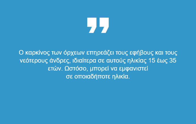 - Ηλικία: Ο καρκίνος των όρχεων επηρεάζει τους εφήβους και τους νεότερους άνδρες, ιδιαίτερα σε αυτούς ηλικίας 15 έως 35 ετών. Ωστόσο, μπορεί να εμφανιστεί σε οποιαδήποτε ηλικία.