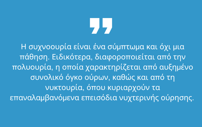 Η συχνοουρία είναι ένα σύμπτωμα και όχι μια πάθηση. Ειδικότερα, διαφοροποιείται από την πολυουρία, η οποία χαρακτηρίζεται από αυξημένο συνολικό όγκο ούρων, καθώς και από τη νυκτουρία, όπου κυριαρχούν τα επαναλαμβανόμενα επεισόδια νυχτερινής ούρησης.