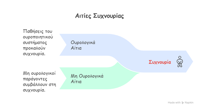 Τα οργανικά αίτια της συχνοουρίας διακρίνονται σε εκείνα που προέρχονται από παθήσεις του ουροποιητικού συστήματος και σε άλλα που οφείλονται σε μη ουρολογικούς παράγοντες.